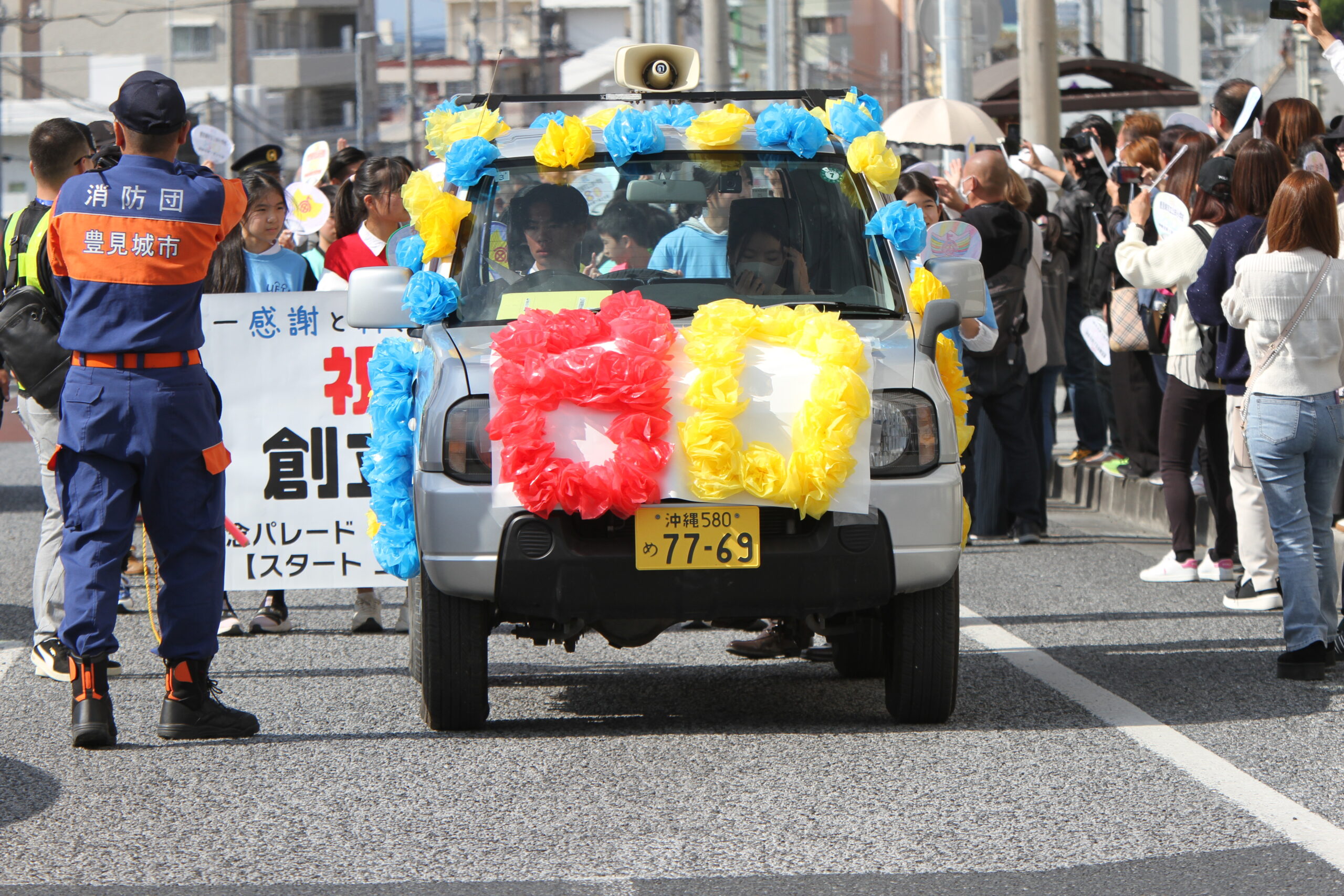 • 市内ボランティアの豊見城市商工会、上田小PTA、豊見城市消防団、豊見城警察署、近隣自治会、豊見城防災士の会  そしてFMとよみなど多くの方々が広報車を先頭にパレードが行われました。